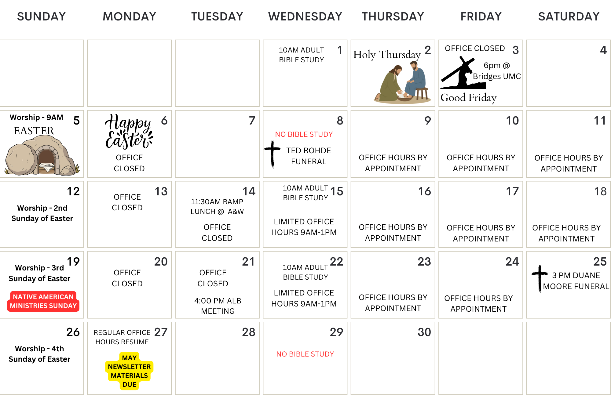 [Promotional graphic for Sunday worship service featuring the title ‘SUNDAY WORSHIP,’ details for joining via Zoom at 9 AM.][A monthly calendar highlighting events for April, including worship services and office closures.]A flyer for Holy Week services at Bridges and Faith UMCs, featuring details for Palm Passion Sunday and Good Friday services, including dates, times, and locations.In loving memory of Theodore C. Rhode, celebrating a life from January 22, 1933, to March 20, 2026. Promotional image for A&W’s Ramp Lunch featuring a frosty mug of root beer, a cheeseburger with lettuce and cheese, onion rings, and condiments including mustard and ketchup. Event details include the date, April 14, at 11:30 AM, and location, A&W Family Restaurant, 3005 South Ave., La Crosse.A woman sitting outdoors in a natural setting, with her eyes closed and a peaceful expression, surrounded by greenery. The image promotes Native American Ministries Sunday on April 19th, highlighting the importance of Indigenous cultures and support for Native American leaders and students.Memorial tribute for Duane King Moore with his photo, including his birth and death dates, details of the service of remembrance at Faith United Methodist Church on April 25 at 3pm.